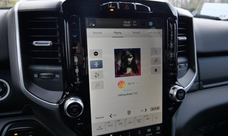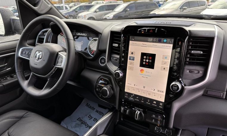 - BIG HORN LEVEL 2 EQUIPMENT GROUP: Google Android Auto; SiriusXM Radio Service; Bluetooth Handsfree Phone & Audio; USB Host Flip; Rear Window Defroster; For Details; Visit DriveUconnect.com; Integrated Center Stack Radio; ParkSense Front/Rear Park Assist w/Stop; Rear View Auto Dim Mirror; Power Adjustable Pedals; Rear Power Sliding Window; Rear Dome w/On/Off Switch Lamp; Connectivity - US/Canada; Glove Box Lamp; 4G LTE Wi-Fi Hot Spot; 115V Auxiliary Rear Power Outlet; Media Hub w/2 Charge Only USBs; Exterior Mirrors w/Heating Element; Power 8-Way Driver Seat; Auto Dim Exterior Driver Mirror; Heated Front Seats; Radio: Uconnect 5 W w/8.4" Display; Heated Steering Wheel; 8.4" Touchscreen Display; Class IV Receiver Hitch; Security Alarm; Black Premium Power Mirrors; Apple CarPlay; Big Horn IP Badge; Remote Start System; SiriusXM Satellite Radio; Exterior Mirrors w/Supplemental Signals; Exterior Mirrors Courtesy Lamps; Air Conditioning ATC w/Dual Zone Control; 115V Auxiliary Power Outlet; 400W Inverter;